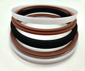 O conjunto de vedação para pistões de dupla ação ZW-01 é composto por um componente de vedação em elastômero, dois anéis anti-extrusão e dois anéis guia angulares. Nesse exemplo de NBR + Poliacetal + Poliuretano.