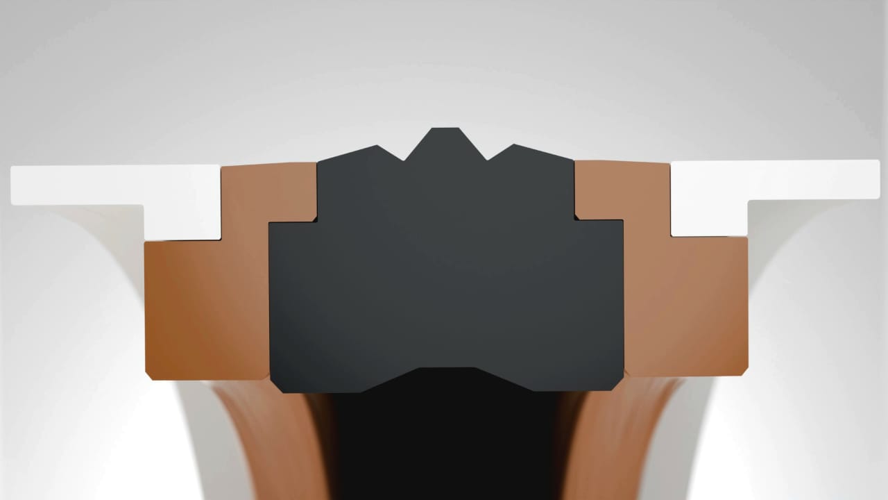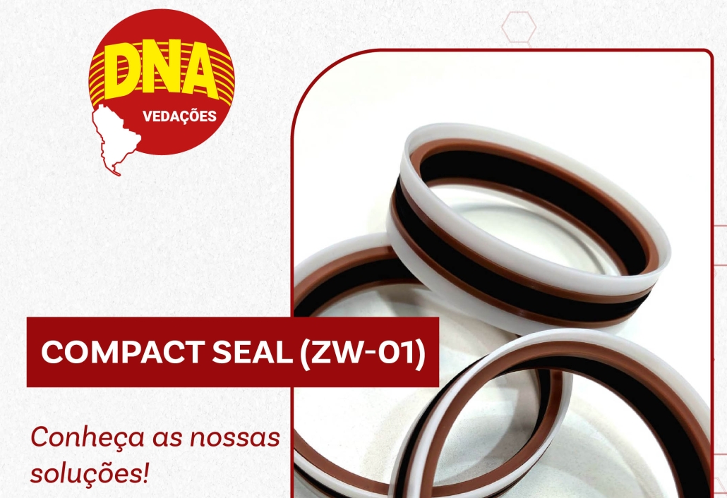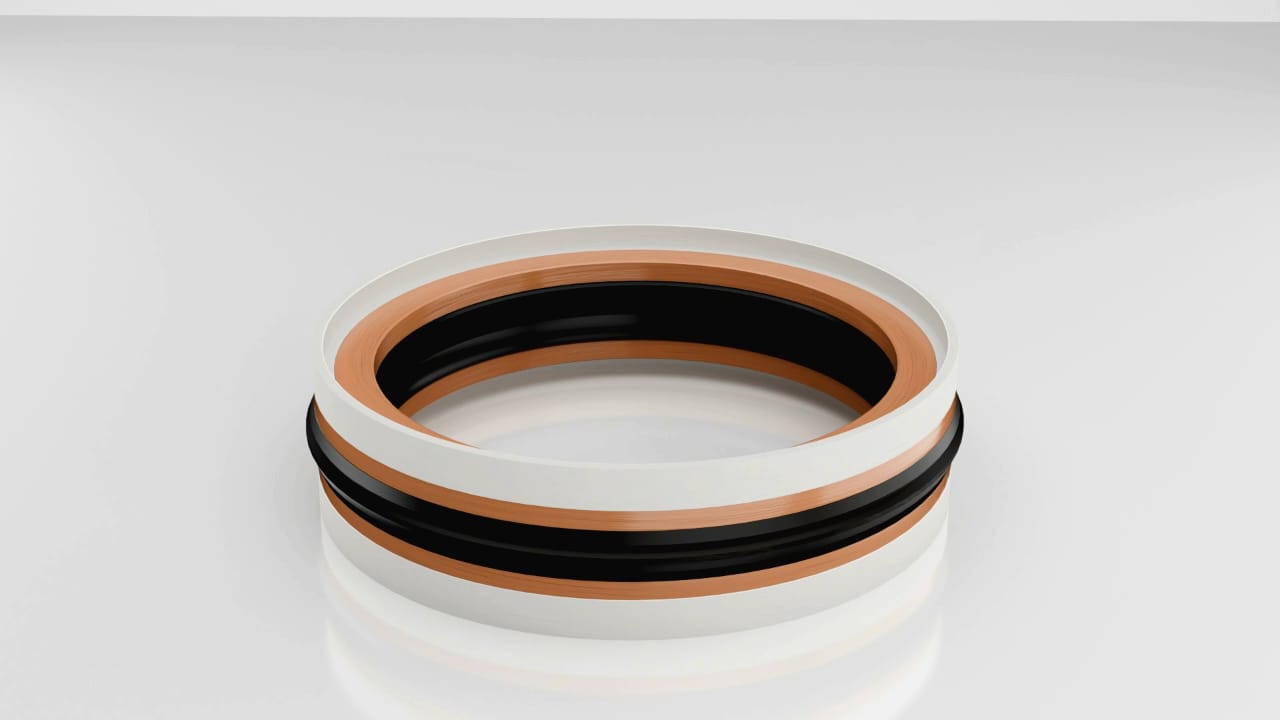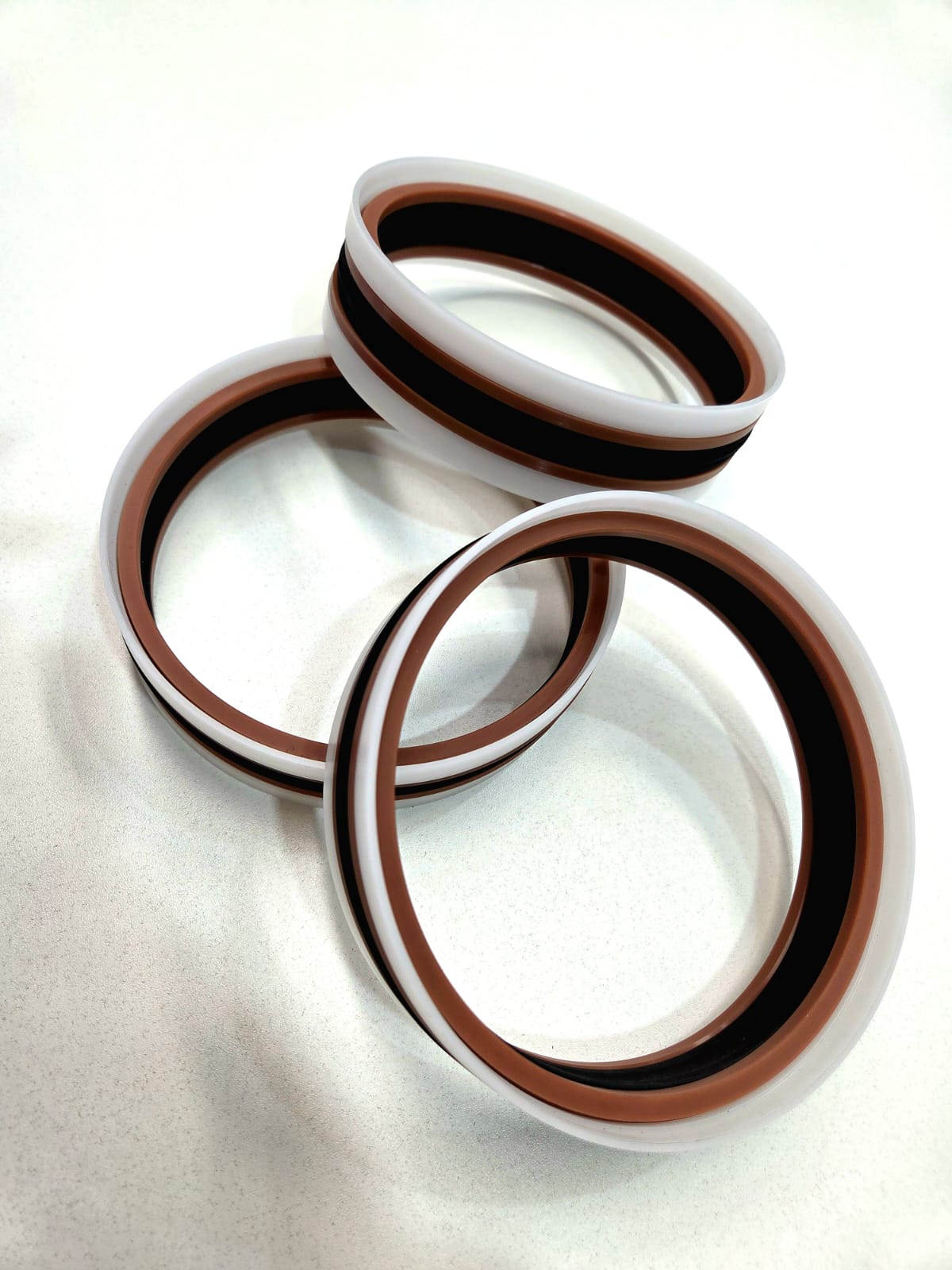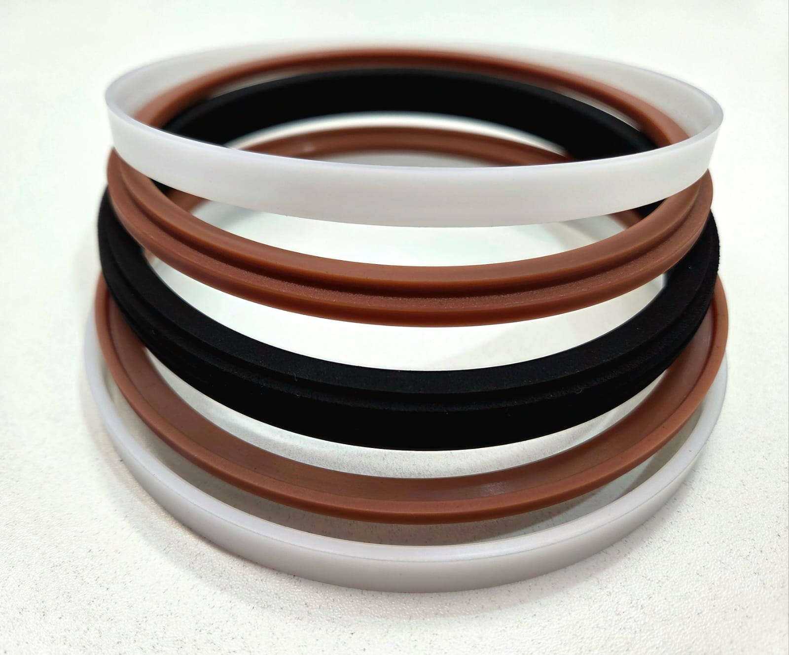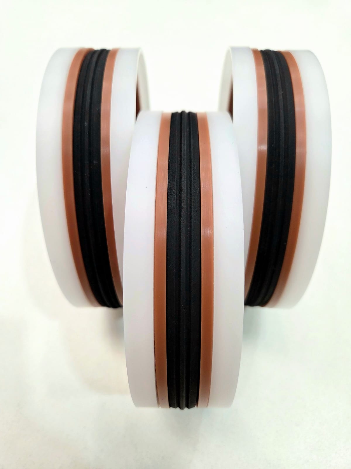 O conjunto de vedação para pistões de dupla ação ZW-01 é composto por um componente de vedação em elastômero, dois anéis anti-extrusão e dois anéis guia angulares. Nesse exemplo de NBR + Poliacetal + Poliuretano.